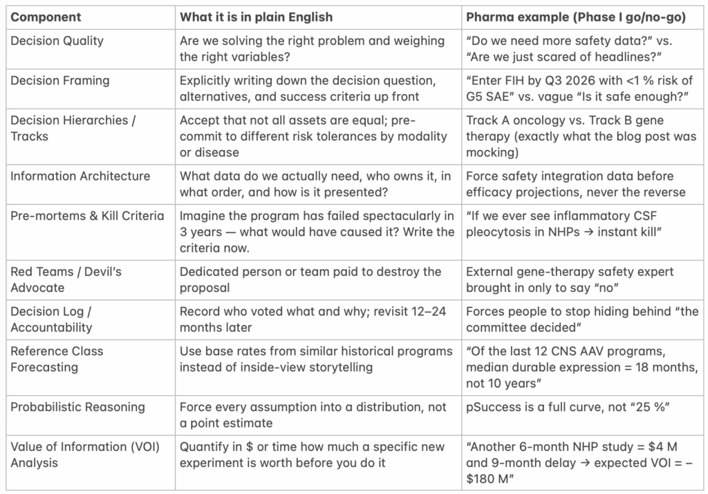 Decision-making In Complex Environments – heavy on pre-mortems, reference-class base rates, and mandatory decision logs. - Kepner-Tregoe (old but still alive at GSK, Sanofi)