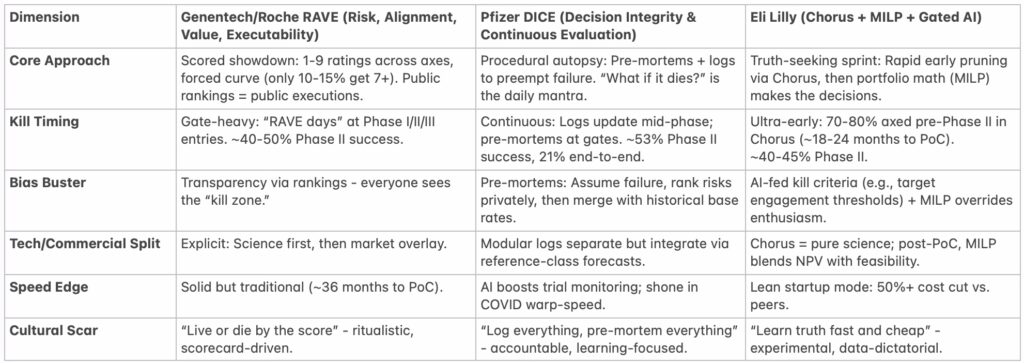 The rest of this post distills a recent X thread sparked by the start of the post. (A shoutout to @biobrainbox for the follow-up question on correlations to success rates.) I’ll compare the big three frameworks – Genentech/Roche’s RAVE, Pfizer’s DICE, and Eli Lilly’s integrated beast (Chorus + MILP optimization) – drawing lessons from my Substack posts on asymmetric bets and innovation traps. And, my 2023 IDEA Collider interview with Dan Skovronsky, Lilly’s CSO, who discussed “truth-seeking” over wishful thinking. (If you haven’t watched it, you should: IDEA Collider | Dan Skovronsky. It’s 45 minutes that everyone should watch.)